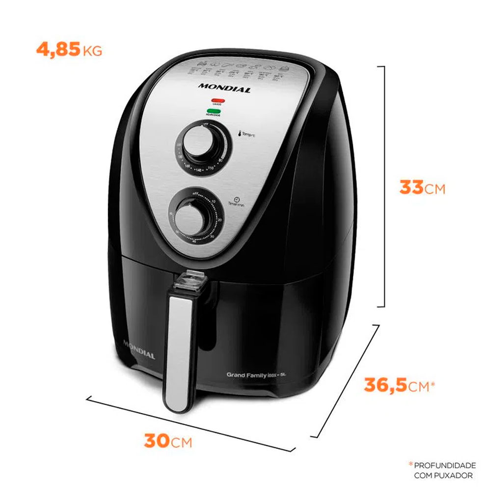 La Air Fryer Mondial puede aportar practicidad y alimentación saludable a tu rutina diaria. ¡Y con la cesta de 5 litros de capacidad, podrás compartir estos beneficios con toda tu familia! La tecnología de circulación de aire caliente cocina, fríe (aire), hornea o tuesta alimentos sin necesidad de agregar aceite o mantequilla. Combinada con alta potencia, la tecnología de Air Fryer también permite preparaciones rápidas.